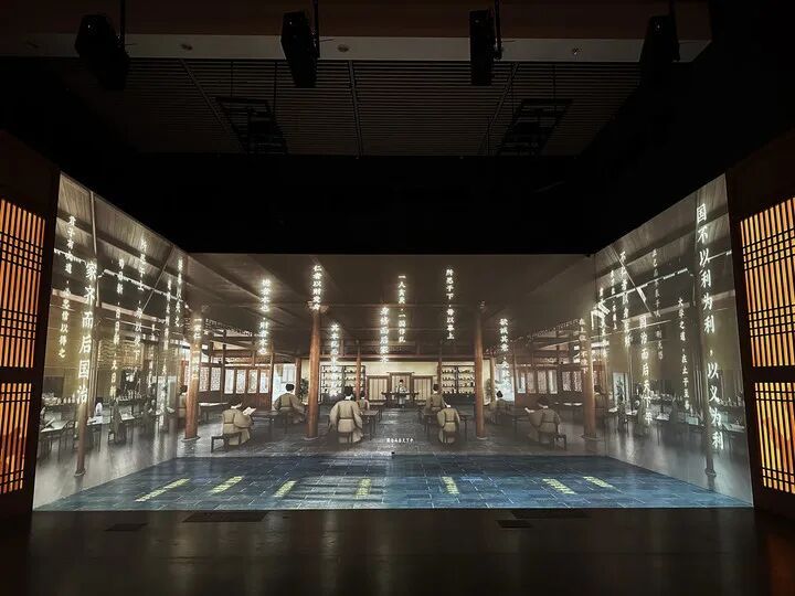 为了让古老典籍不再高冷,展览设置了多个沉浸式多媒体展项。“书院传道”利用LED屏再现杏坛讲学、白鹿洞书院缘起、嵩阳书院二程讲学、鹅湖之会等代表性场景;“书院四季”运用投影打造裸眼3D效果,晨读、会讲、祭祀、藏书刻书四大场景轮番呈现,光影交错间,观众仿佛一脚踏回千年前的书院;“书院漫游”实景VR体验区让观众戴上眼镜,足不出户便身临其境游历岳麓书院。