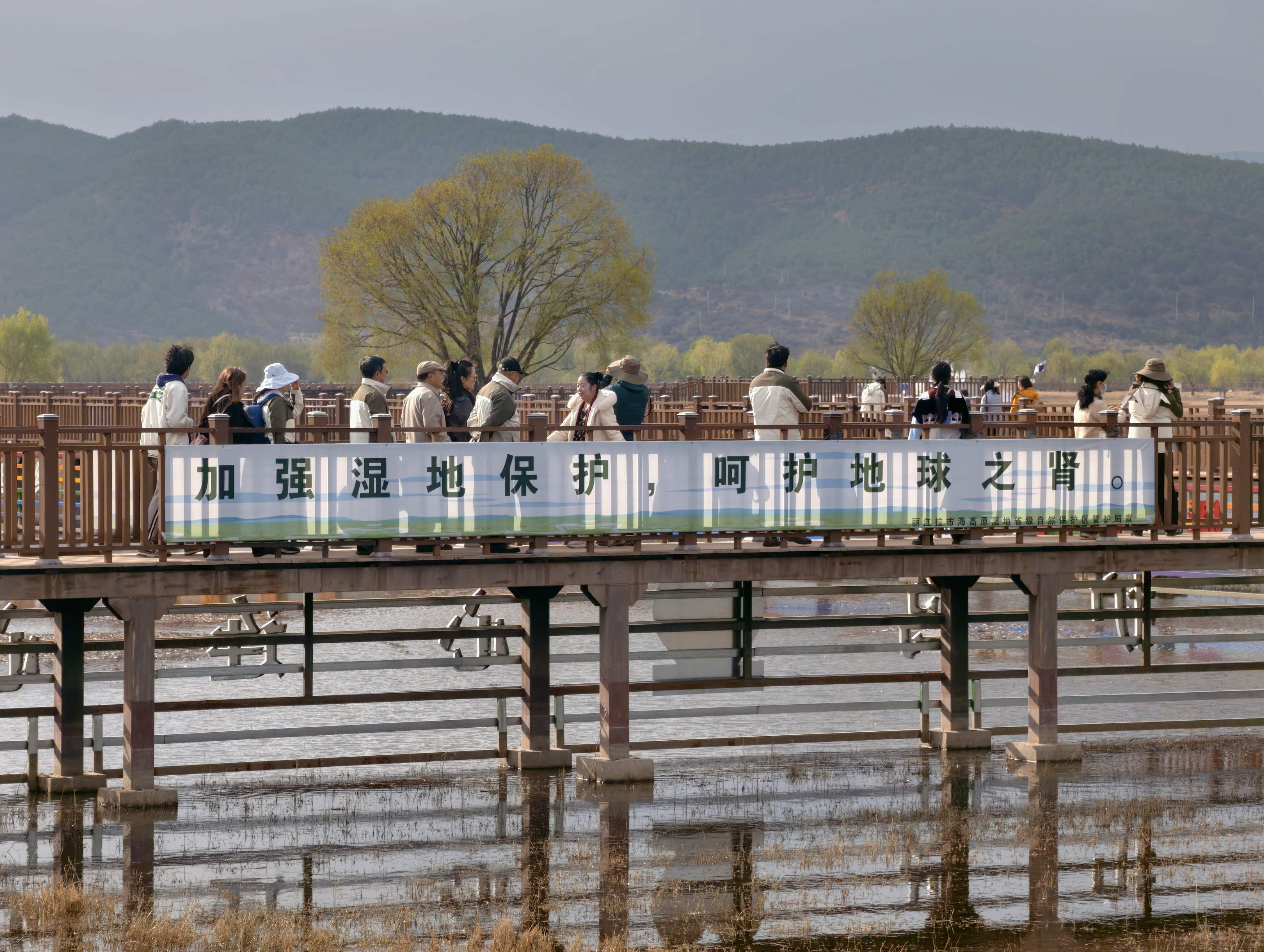 阳春三月,位于云南省丽江市玉龙纳西族自治县(以下简称玉龙县)的拉市海高原湿地宛若一幅灵动的油画,蓝天白云下,成群灰鹤沐浴暖阳,在湖岸空地悠闲散步;清澈水面上,更多候鸟游弋停歇、嬉戏觅食;观鸟栈道里,大批游客一边惊叹一边不停拍摄难得一见的生态奇观。