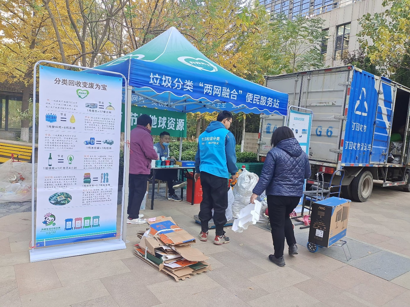 每月10日、20日、30日,小区广场上都会支起醒目的蓝色帐篷。居民可以在这3天集中投放可回收物,现场称重、现场积分。对于高龄老人和行动不便者,社区还提供上门回收服务。