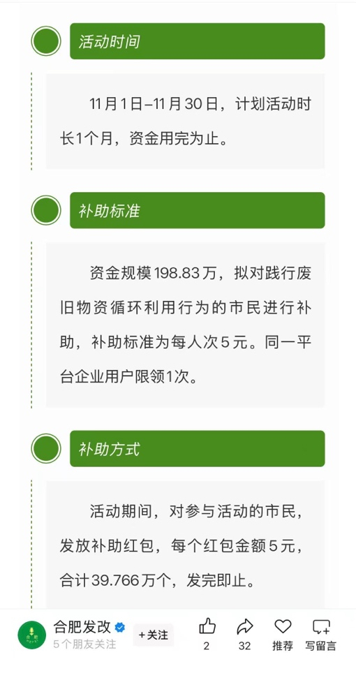 据悉,本次补助活动将持续至11月30日,市民可通过“碳惠庐州”小程序了解参与方式和活动细则。补贴资金发完即止。