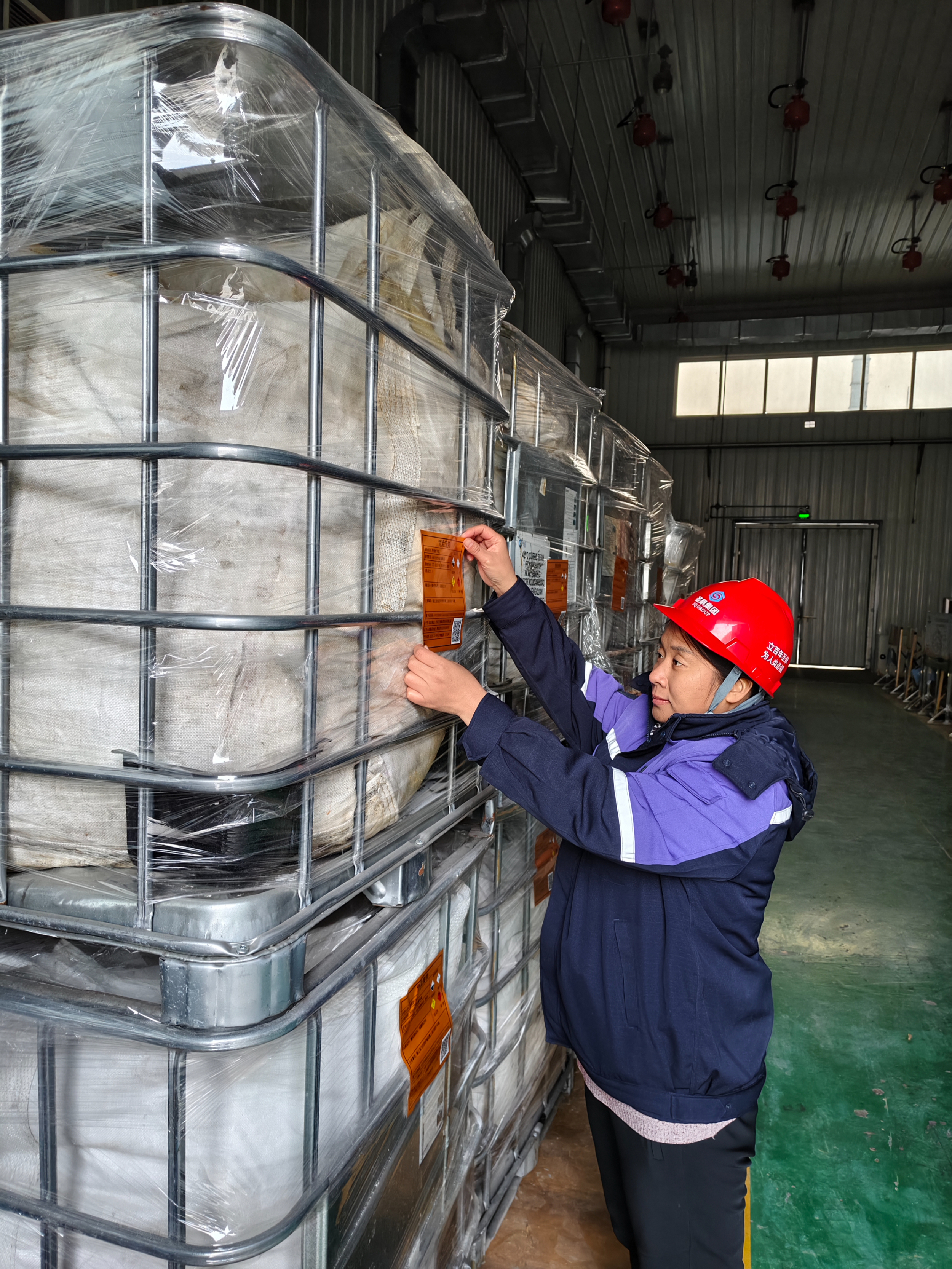 图为企业环保管理人员按照危险废物“五即”规范管理要求,对产生的废活性炭开展危险废物标识张贴和入库管理工作。